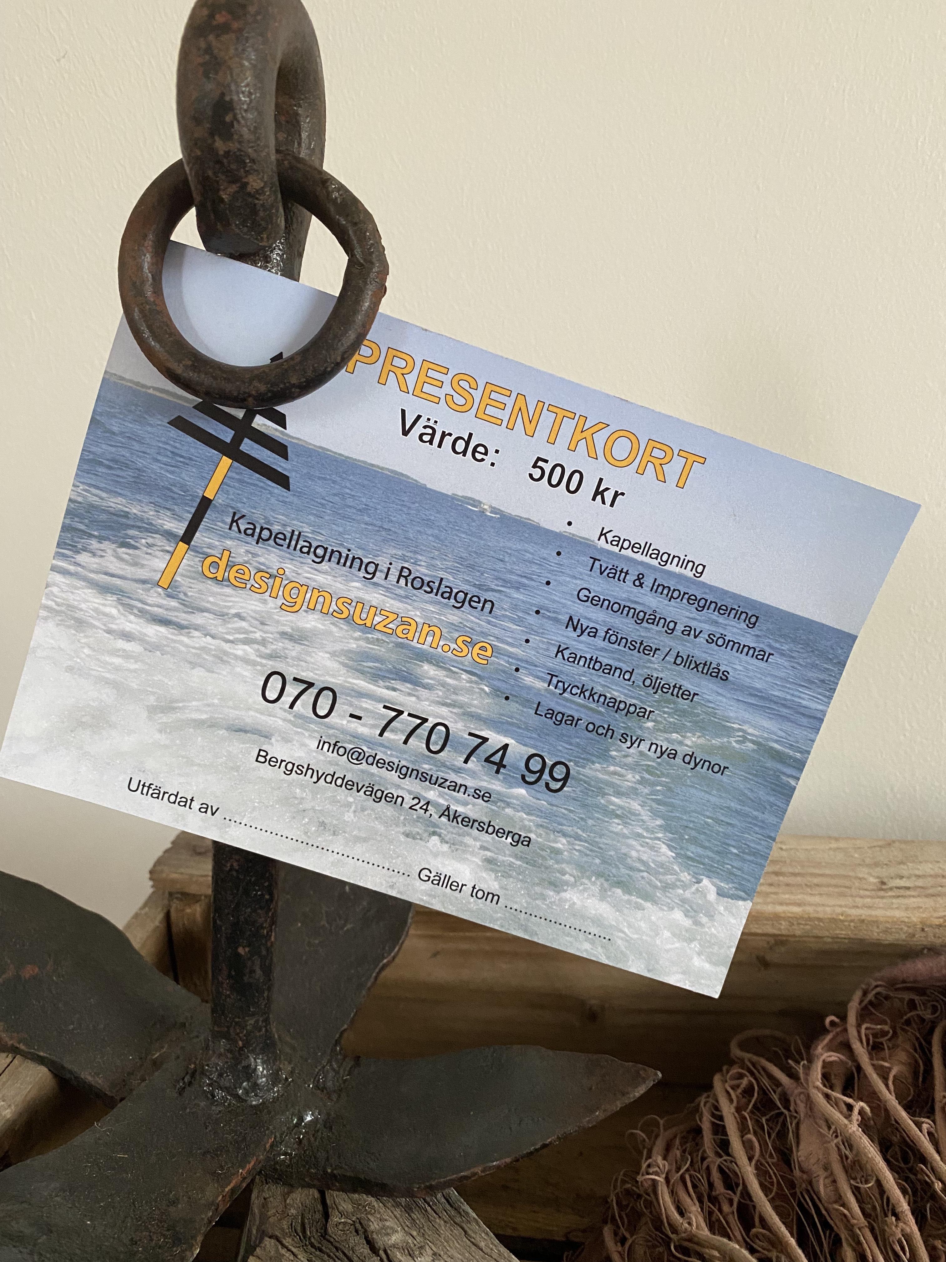 Presentkort från designsuzan.se kan användas till så mycket. Behöver kapellet tvättas? Ska dynorna uppgraderas? Kanske är det bara sömmar som ska lagas. Allt detta ryms i presentkorten från designsuzan.se. Visste du förresten att vi kan hjälpa dig med vindskydd och solskydd också?
